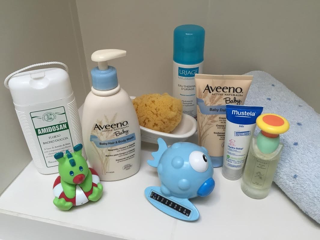 Su consiglio del pediatra ho sempre usato poco sapone delicato nei primissimi mesi di vita, la cute dei piccoli è molto sensibile ed io ho trovato molto utile un bagnoschiuma a base di amido di mais (Amidosan fluido bagno doccia).